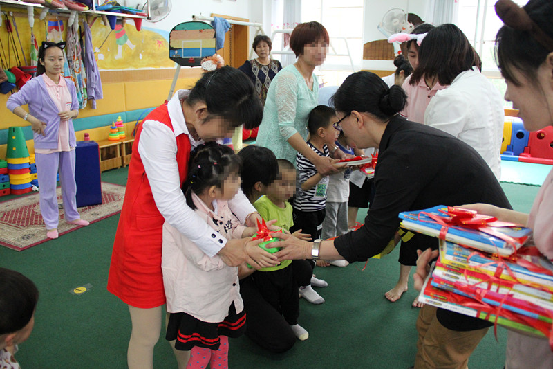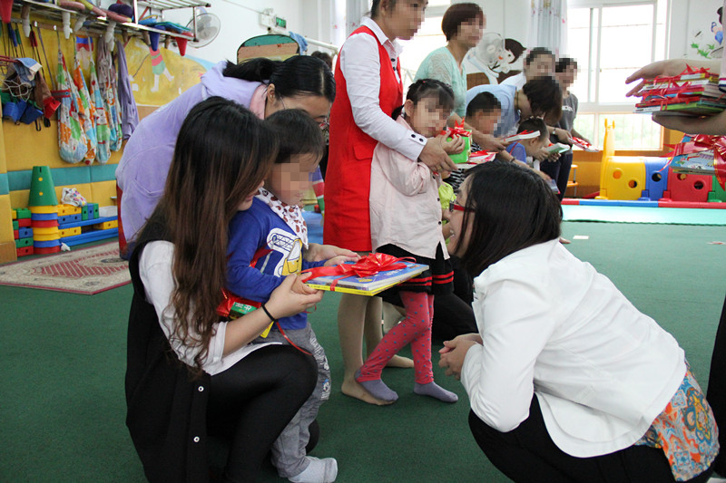 走進(jìn)陽(yáng)光樂(lè)園,學(xué)校老師對(duì)我們的到來(lái)表示了歡迎,并向我們簡(jiǎn)要介紹了學(xué)校目前在校孩子的總體情況和康復(fù)狀況。此時(shí)恰逢孩子們的游戲時(shí)間,老師帶領(lǐng)我們觀看了孩子們做游戲。在日常生活中,這些特殊兒童的言行舉止或許和常人略有不同,但在游戲過(guò)程中,這些孩子透露出和其他孩子一樣的天真和爛漫。游戲過(guò)程中,一位可愛(ài)的孩子想請(qǐng)我們和他一起做游戲,收到突然的邀請(qǐng),讓我們感到又驚訝又喜悅。僅僅一個(gè)小時(shí)左右的游戲時(shí)間,孩子們的可愛(ài)和友善深深打動(dòng)了我們,我們被這里的孩子們不易的成長(zhǎng)經(jīng)歷深深感動(dòng),也對(duì)所有老師們付出的辛勤汗水深表敬意,同時(shí)也相信,在這樣的環(huán)境中,特殊兒童定能有所康復(fù)。最后,我們還向孩子們贈(zèng)送了兒童書(shū)籍作為節(jié)日禮物,孩子一聲聲甜甜的“謝謝”又一次讓我們堅(jiān)定地認(rèn)為,在這里他們一定能健康、快樂(lè)地成長(zhǎng)。