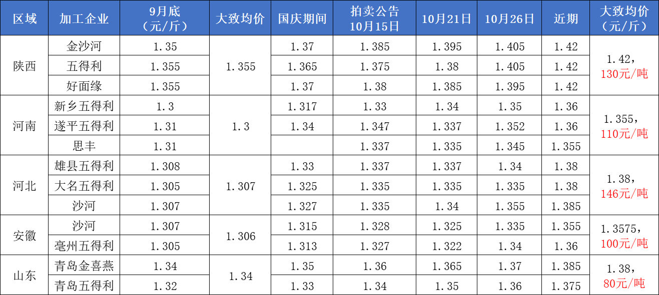 近一個(gè)月來(lái),主產(chǎn)區(qū)小麥經(jīng)歷了一大波上漲行情。加工企業(yè)最近還在互相比賽著加價(jià),而且是一分二分三分地漲,陜西最高價(jià)達(dá)到1.42,河北山東河南正在逼近1.4關(guān)口。