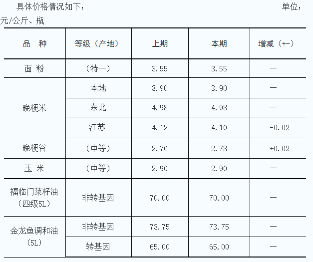 據(jù)監(jiān)測,202211日~117日,目前氣溫適宜糧油儲存,加上春節(jié)臨近,糧油將迎來銷售旺季,市區(qū)各糧油經(jīng)銷商備貨積極,市場成品糧油供應(yīng)品種豐富、貨源充足、銷售價格穩(wěn)定、供應(yīng)秩序良好。原糧晚粳谷市場價格小幅上漲,市場價格走勢向上;飼料市場供應(yīng)價格穩(wěn)定,貨源供應(yīng)充足,但銷售價格仍處于高位。